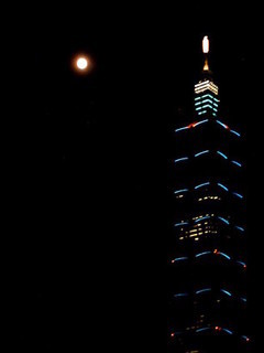 ![]() | 是月偏蝕的前一夜。 剛好有月亮跟高樓。 聽說月亮在接近地平線的時候會變大,而當它跟101等高的時候我想就不用期待它能夠多麼清晰地出現在照片中了。 克服手震除了姿勢正確之外,就只是等待吧。 等自己不再搖晃的那個瞬間; 或是乾脆順著身體的感覺是著讓手維持在原處(應該不太可能......吧) |